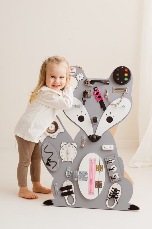 Idealnie nadaje się szczególnie dla dzieci, które szybko się nudzą. Jeśli Wasza pociecha jest bardzo ciekawska i nie potrafi zająć się niczym przez dłużej niż kilka minut, tablica manipulacyjna może okazać się dla niej wspaniałym prezentem. Została bowiem zaprojektowana tak, aby każda zabawa niosła ze sobą nowe odkrycie. W miarę upływu czasu najmłodsi poznają kolejne mechanizmy, które nią rządzą i dowiadują się, do czego służą nieznane wcześniej elementy – zapewnia im to dodatkową frajdę i wspiera dalszy rozwój. Tablica dosłownie rośnie razem z dzieckiem, jest przy tym bardzo estetyczna i starannie wykonana. Wyróżnia się ciekawym, zwierzęcym kształtem i solidnością, dzięki której posłuży przez długi czas.